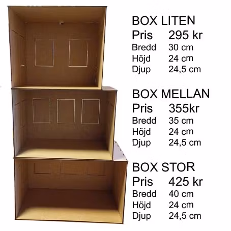 Roombox 295 kr Storlek Liten Mellan Stor I lager Lägg i korgen Lagersaldo: Artikelnummer: 34 Dela Produktbeskrivning Recensioner Detta är enkla byggsatser som är tillverkade i 3mm MDF
